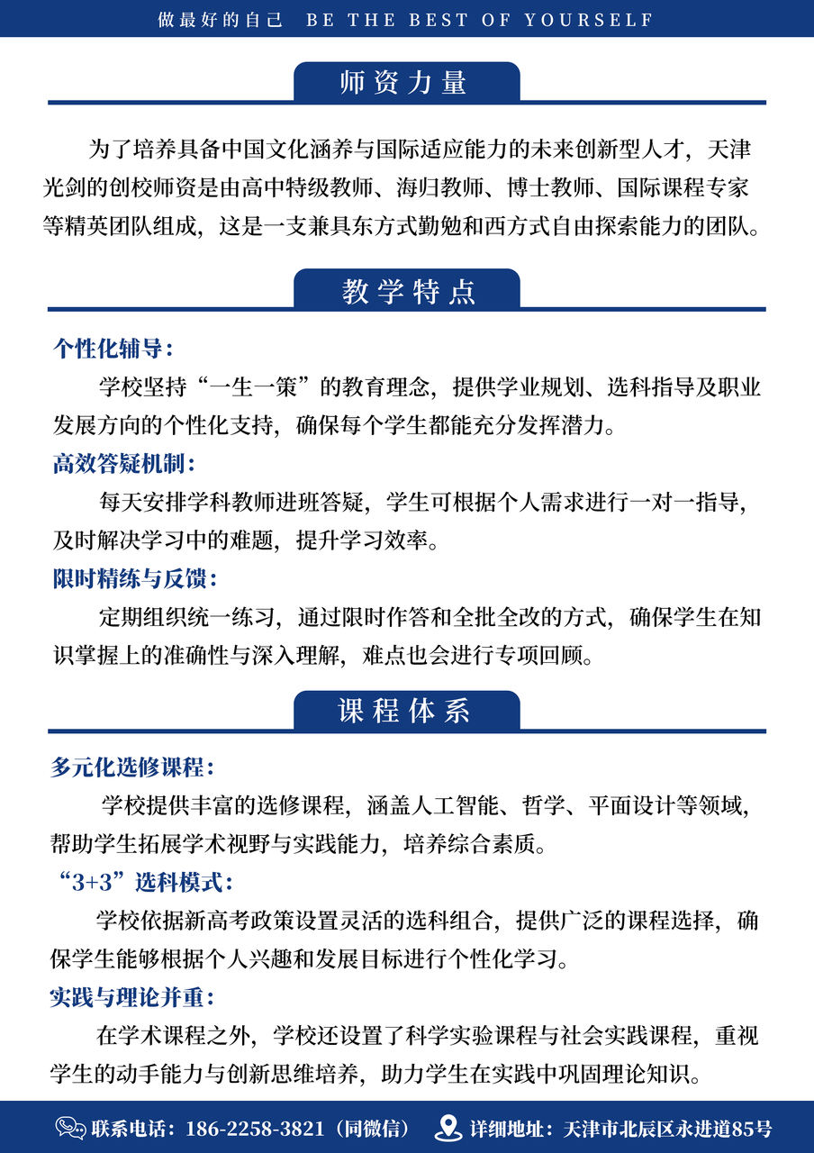 Personalized Coaching: The school adheres to the educational philosophy of "one method for a student," providing personalized support for academic planning, subject selection guidance, and career development direction to ensure that each student can reach their full potential. Efficient Q&A Mechanism: Subject teachers are arranged to answer questions every day, and students can provide one-on-one guidance according to their individual needs, solve problems in learning in a timely manner, and improve learning efficiency. Time-limited refinement and feedback: Regular unified exercises are organized to ensure the accuracy and in-depth understanding of students' knowledge mastery through time-limited answers and full corrections, and special reviews will be conducted on difficult points.